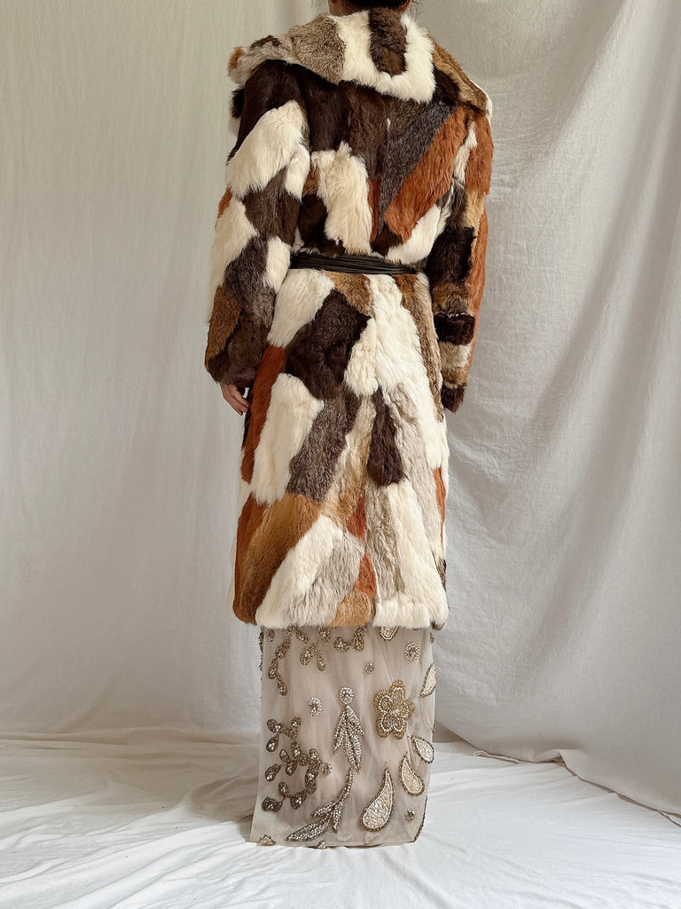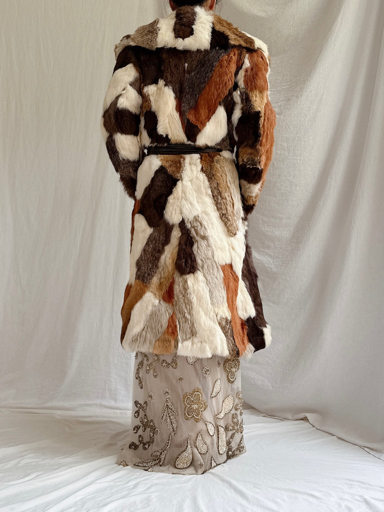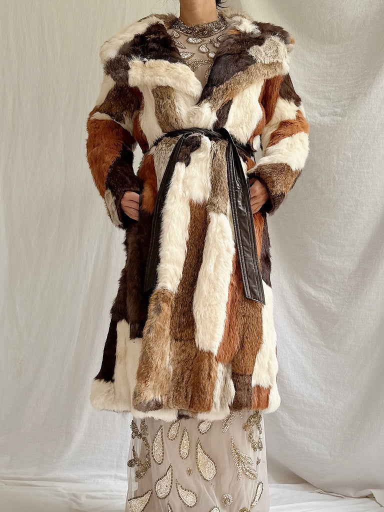 • DESCRIPTION: Vintage Stitched Fur Coat with leather belt.