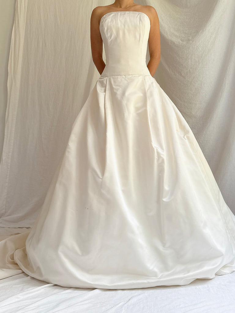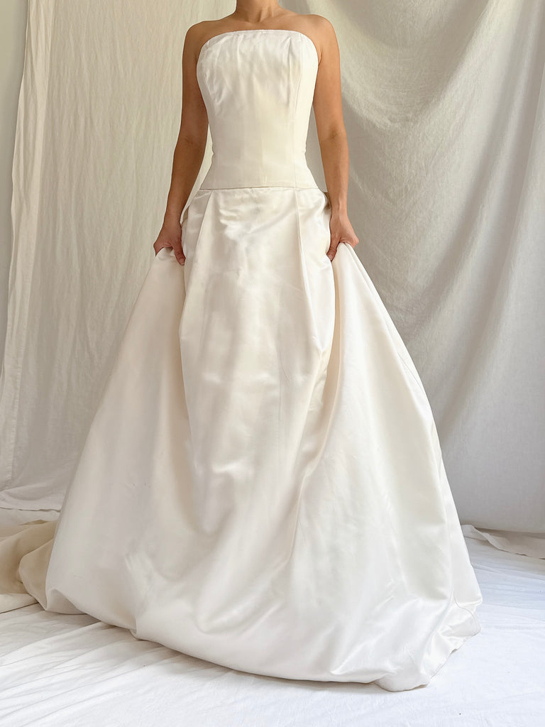 • DESCRIPTION: Vintage Amsale Silk Satin Gown featuring curved strapless bodice with full skirt and back zipper closures.
