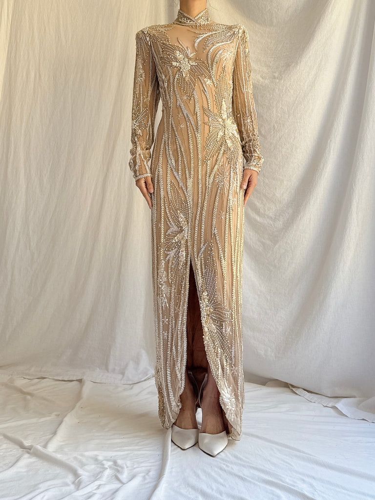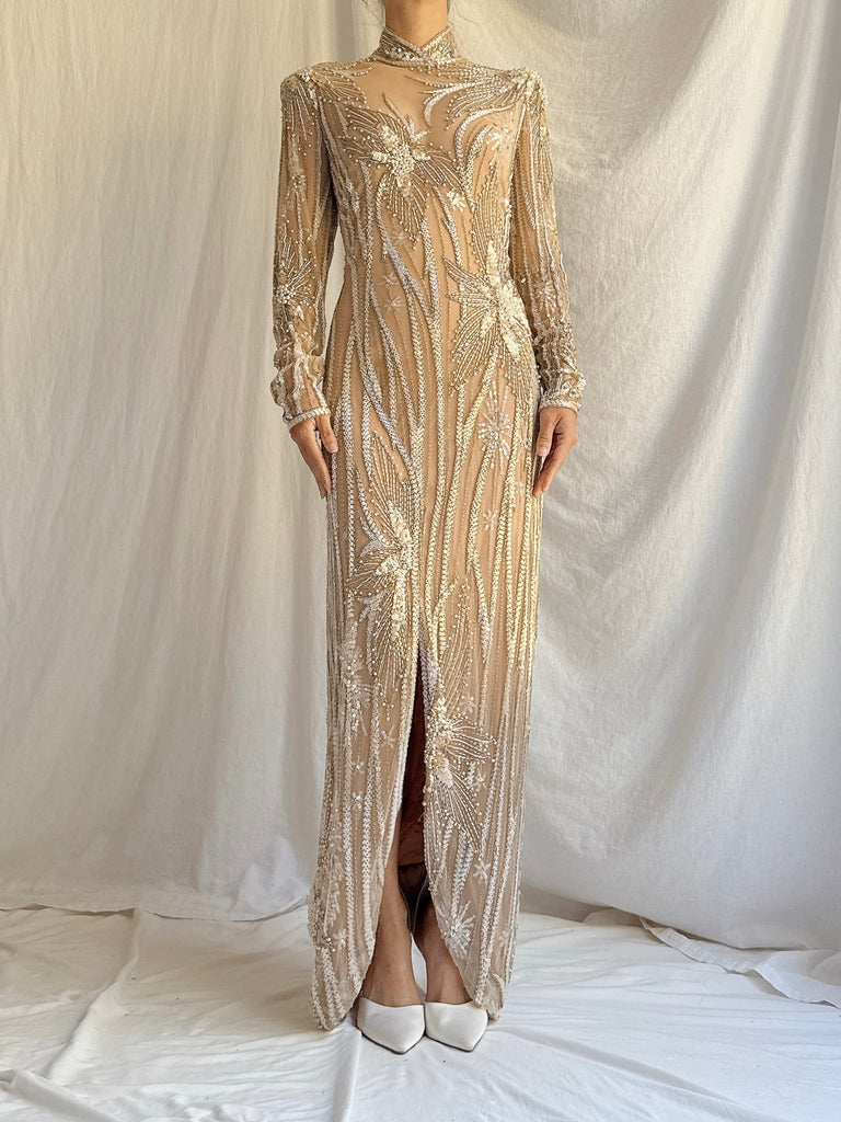 • DESCRIPTION:Vintage Bob Mackie Silk Beaded Gown featuring high neckline with long sleeves and back zipper closures.