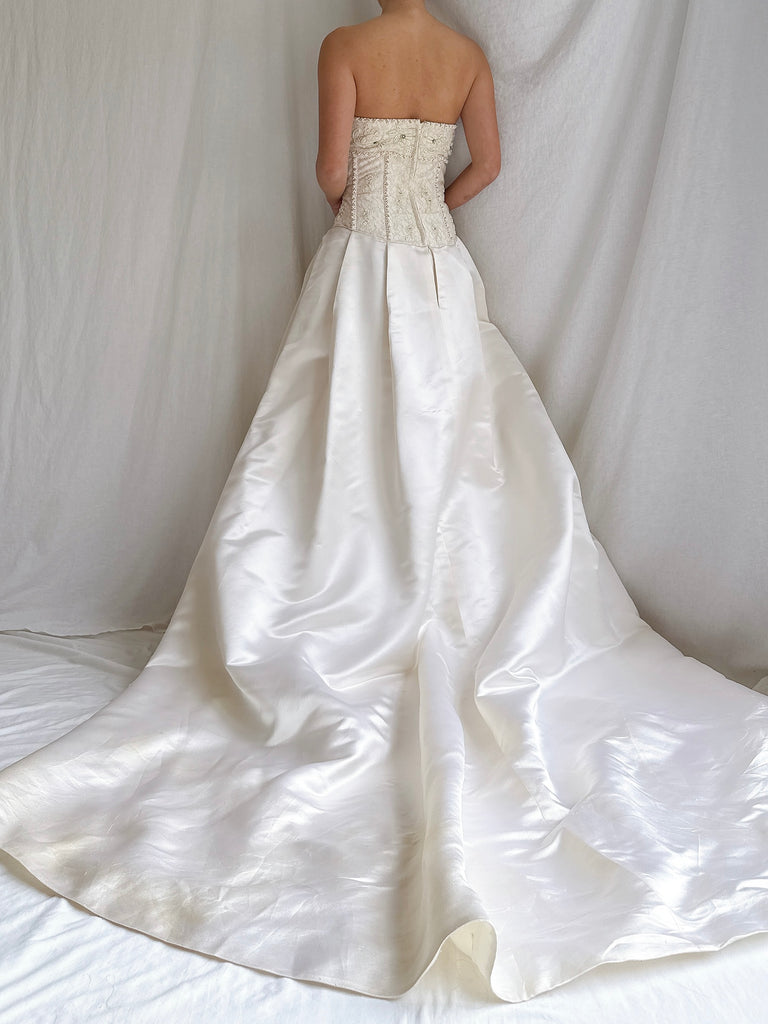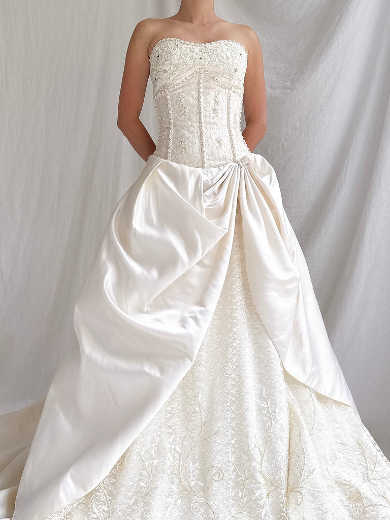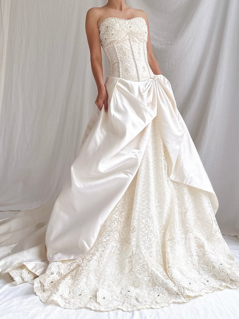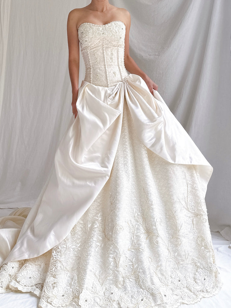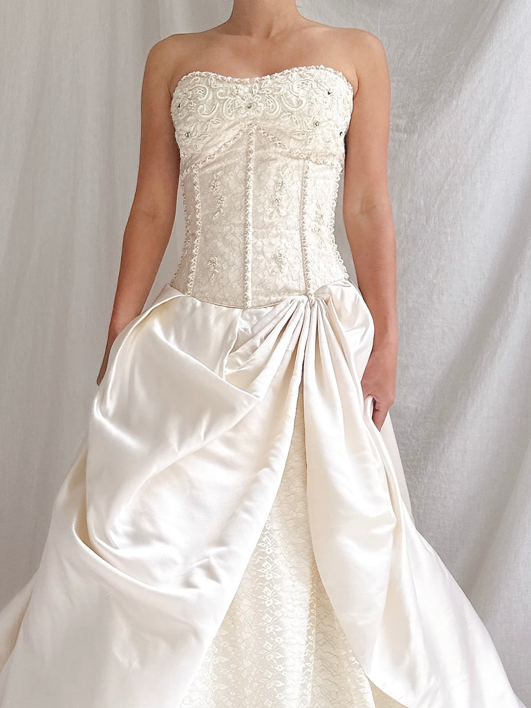 • DESCRIPTION: Vintage Lace and Silk Bustier Gown - M/8