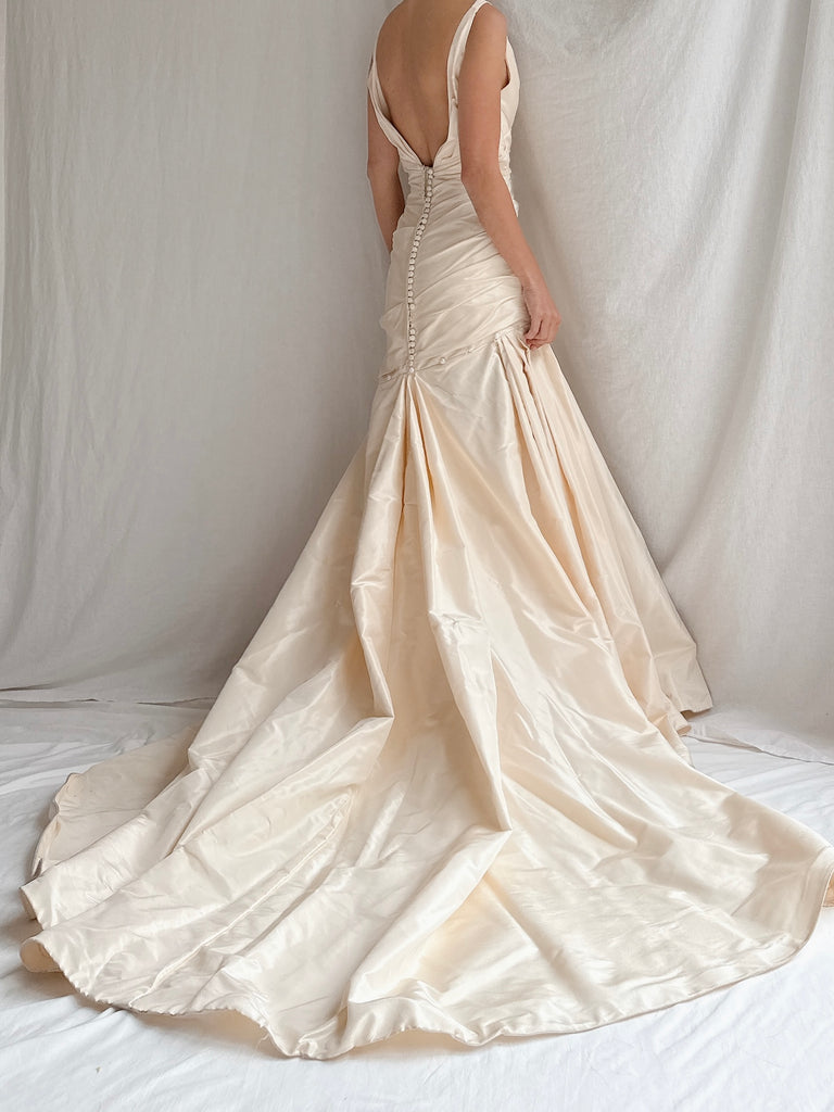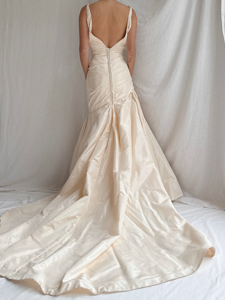 • DESCRIPTION: Vintage Silk Draped Gown featuring v-neckline with ruched waist and bodice.