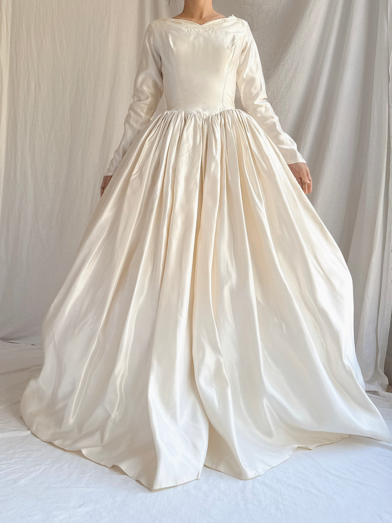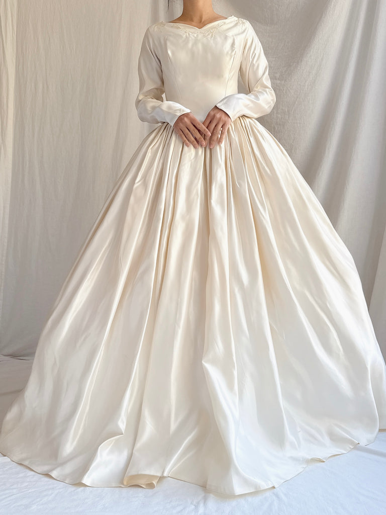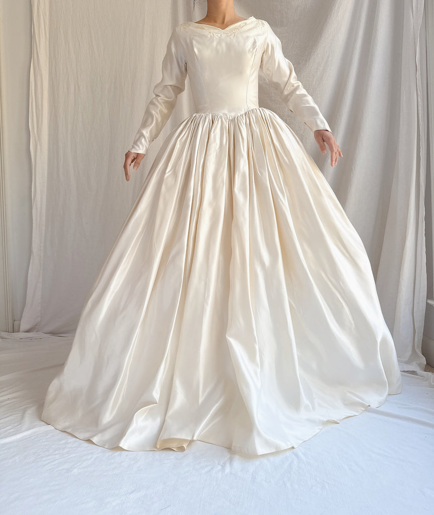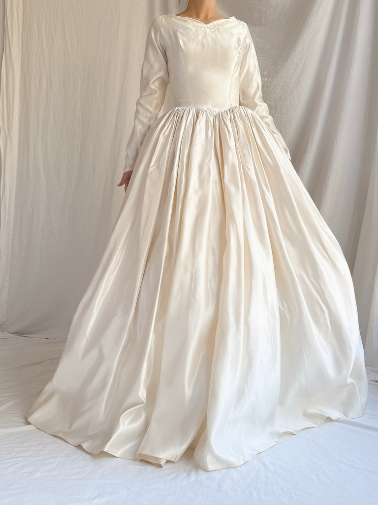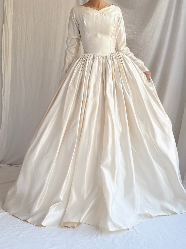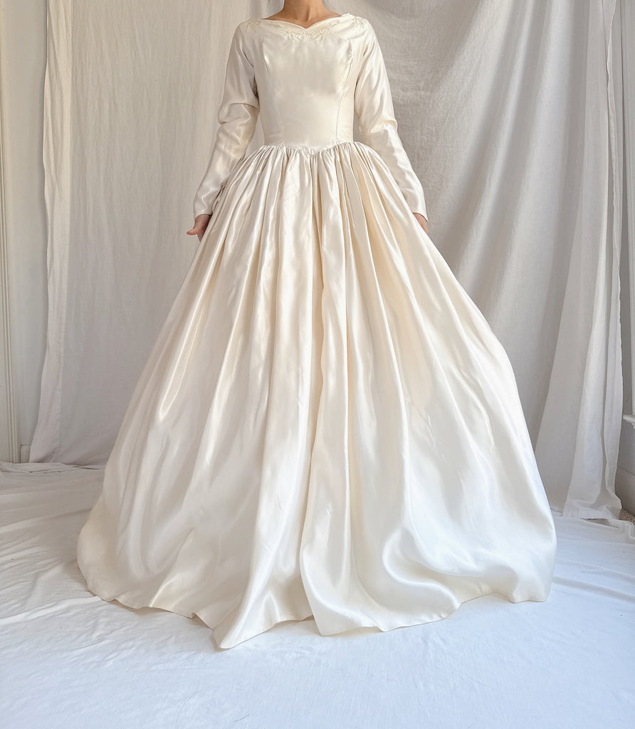• DESCRIPTION: 1960s Hand-Beaded Pearl Gown featuring scoop empire neckline with flowing skirt.