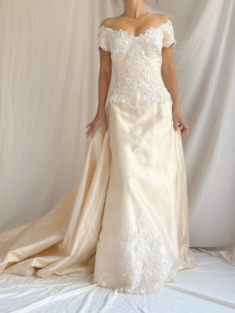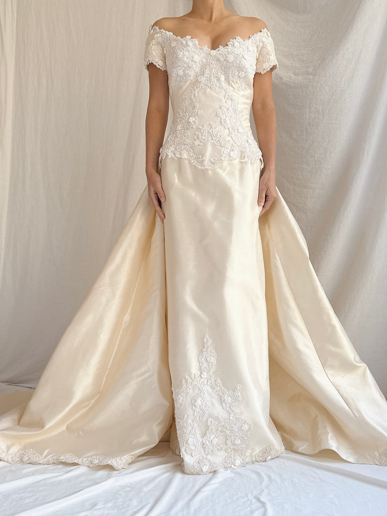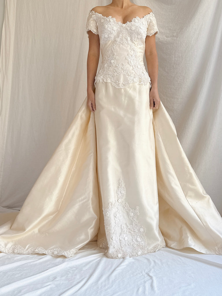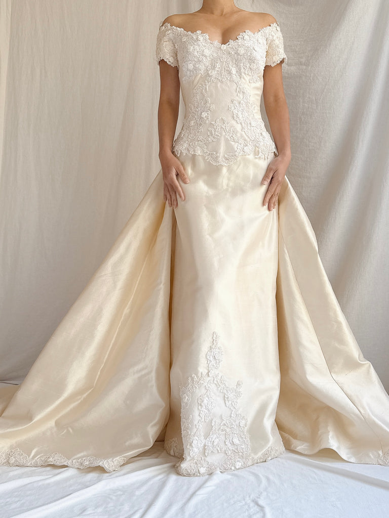 DESCRIPTION: Vintage Silk 2-Piece Set featuring off-the shoulder neckline with detachable train.