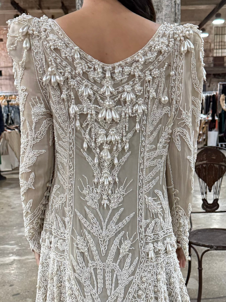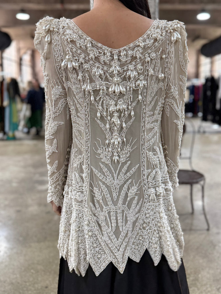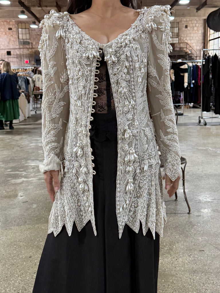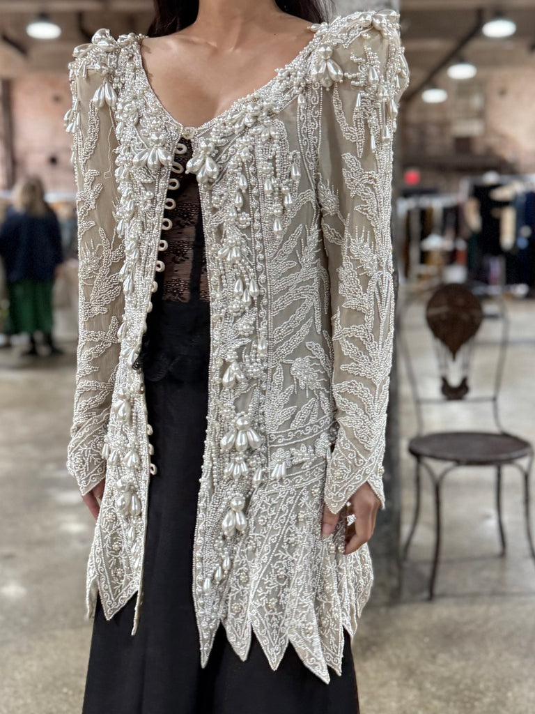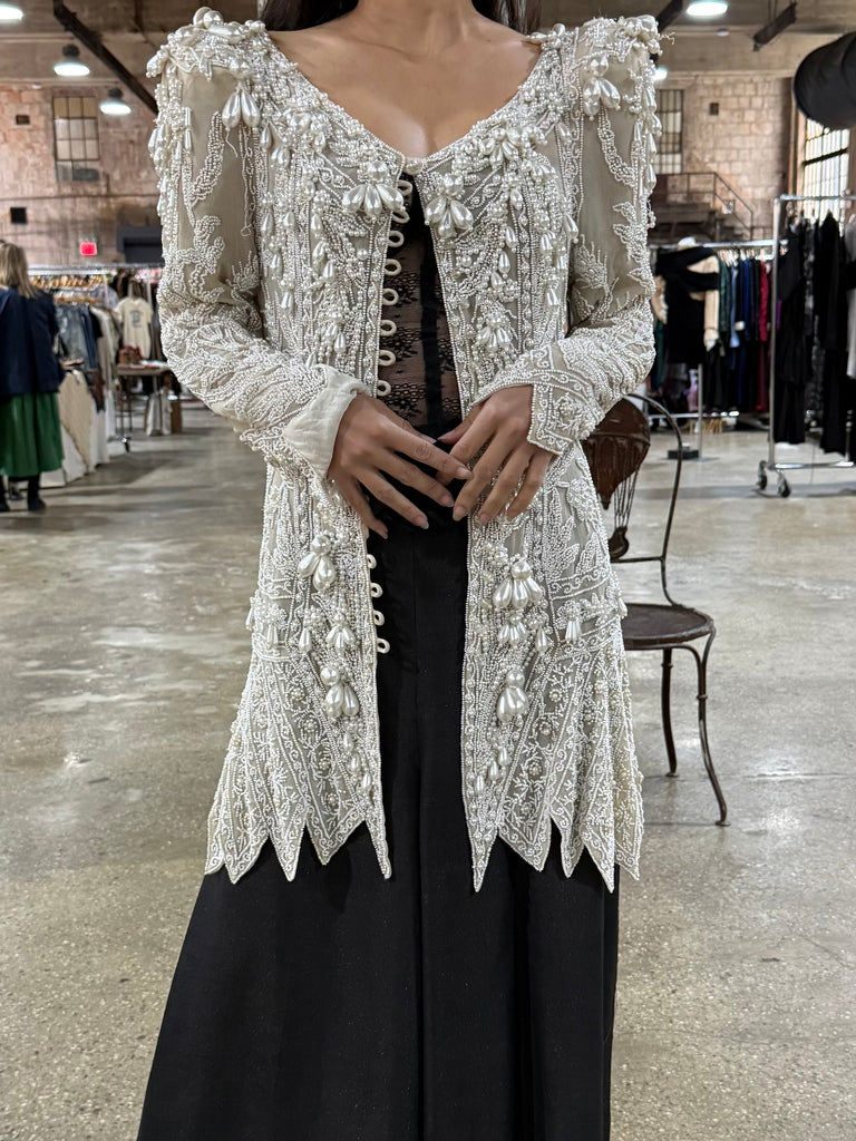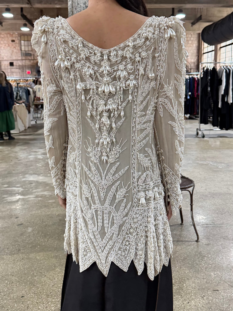 • DESCRIPTION: Vintage Eavis & Brown Silk Duster featuring long sleeves with large pearl beading.