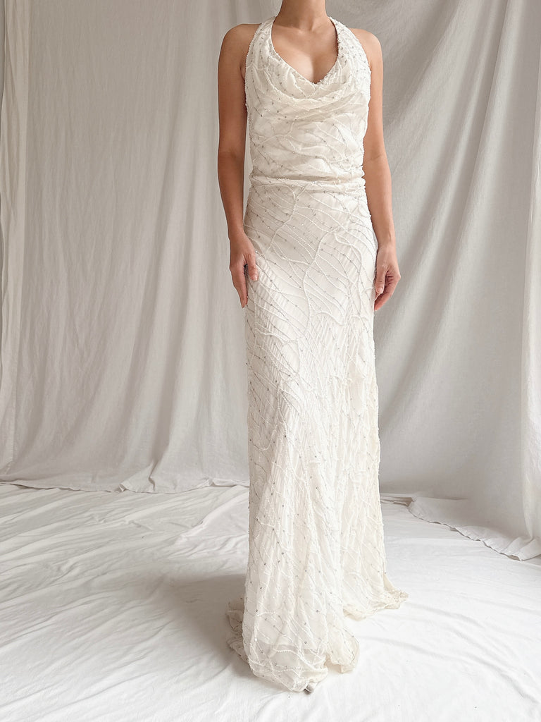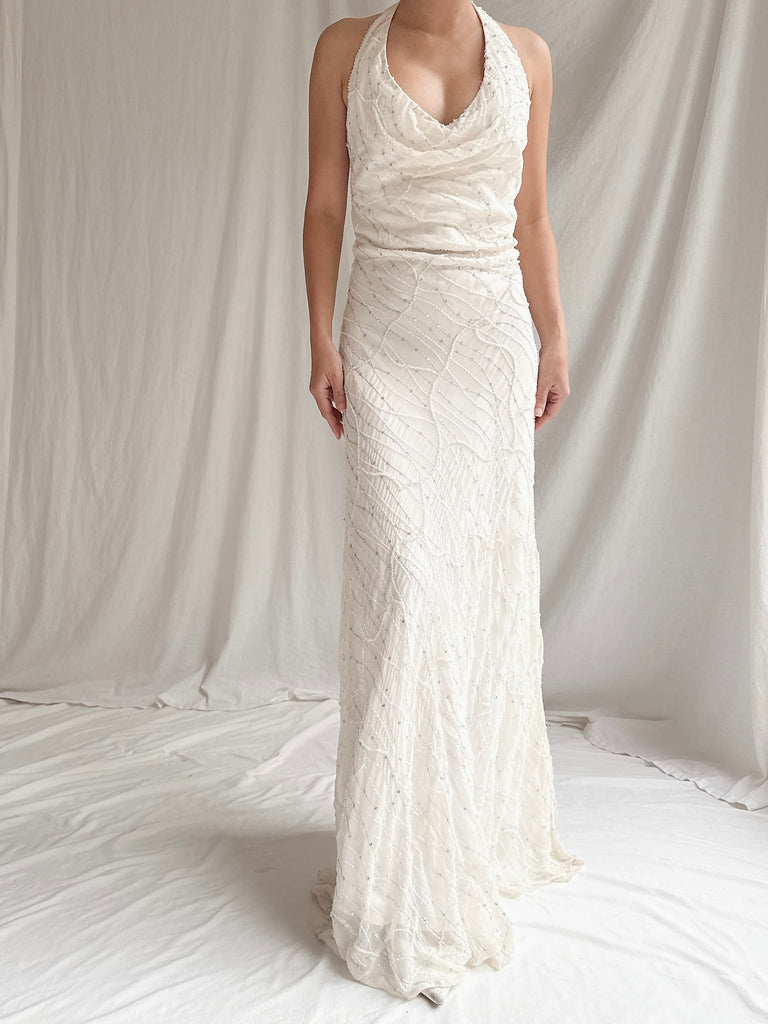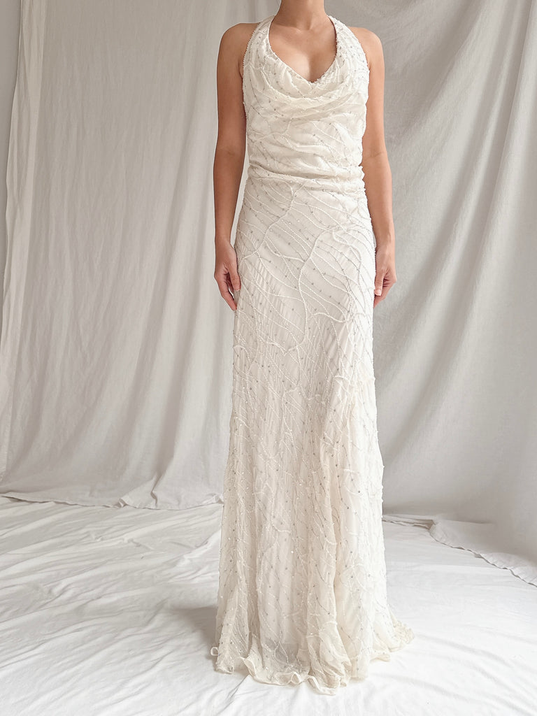 • DESCRIPTION: Vintage Silk Beaded Bias Halter Dress - M