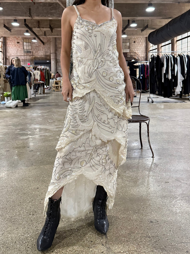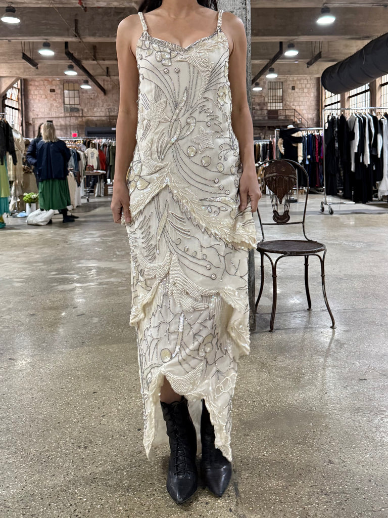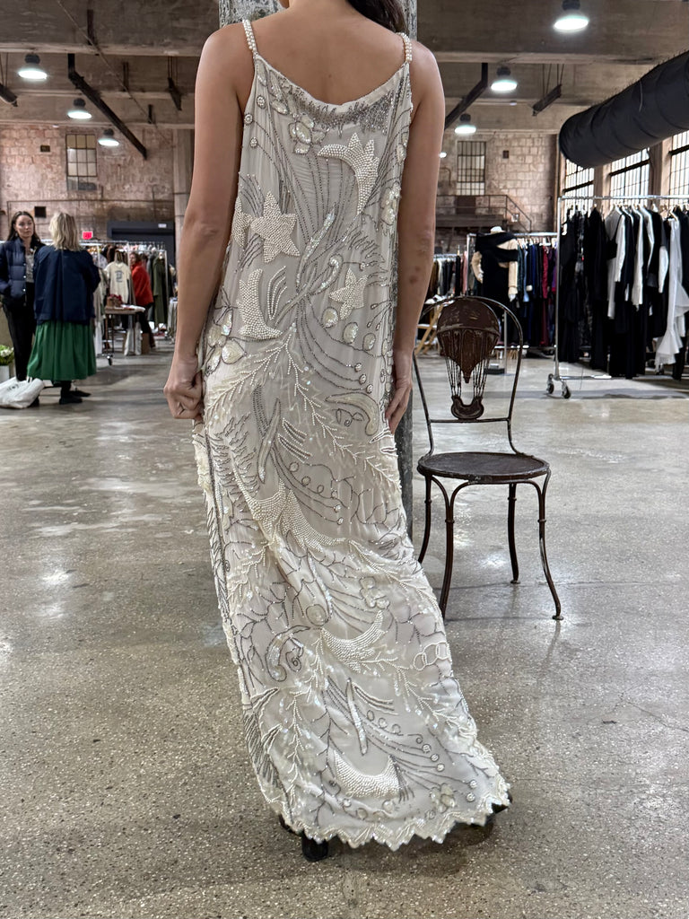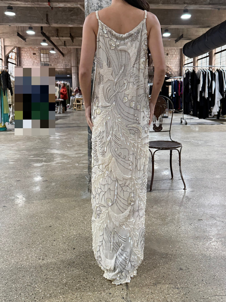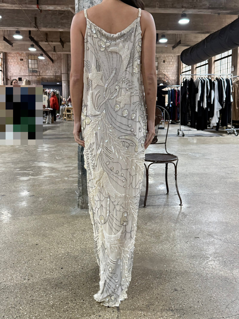 DESCRIPTION: 1980s Silk Chiffon Seed Pearls Stars Dress - S