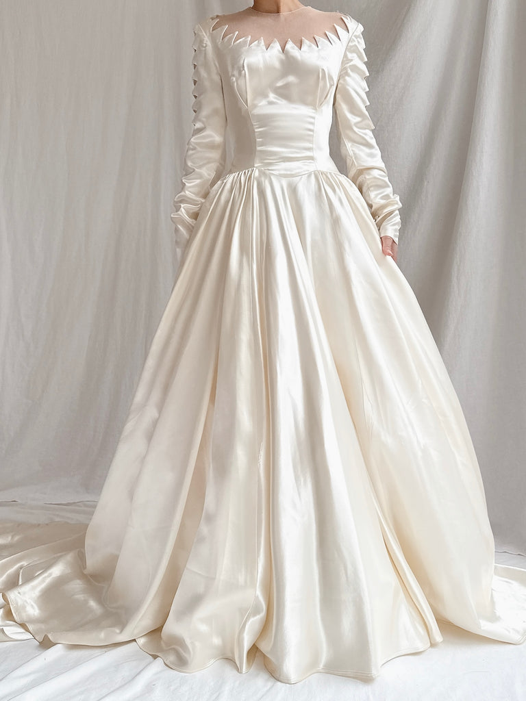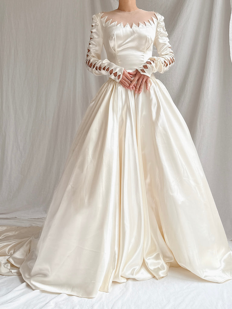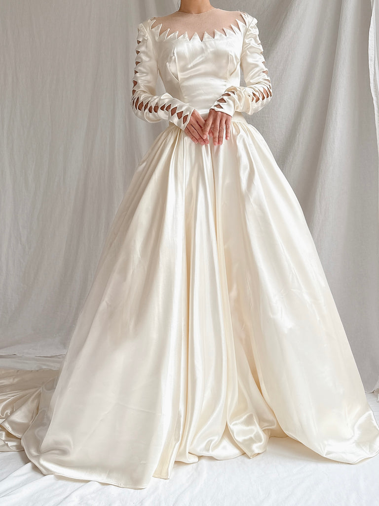 • DESCRIPTION: 1950s Candlelight Satin Gown featuring geometric cutouts and illusion neckline. Side zipper closures.
